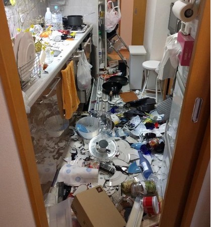 辻家は調味料のボトルが4本倒れただけなのに対して、お隣は食器が割れて危険な状態に。