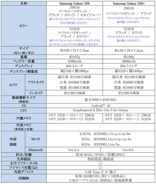 <主な仕様:「Samsung Galaxy S26」、「Samsung Galaxy S26+」>