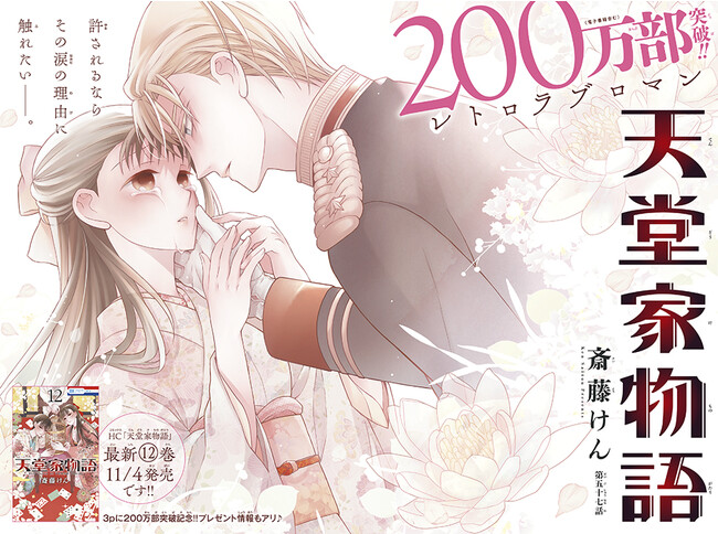 「天堂家物語」最新HC12巻は11月4日(金)発売です。こちらに際し、「200万部突破記念 HC12巻連動 天堂家物語 by 斎藤けん 応募者全員A4クリアファイルプレゼント」も実施します。今号の巻頭カラーイラストを使用したオリジナルデザインのクリアファイルです。HC12巻帯と『LaLa』12月号誌面についている応募券の2枚を集めると応募可能。さらに抽選で20名の方に「描きおろし名ゼリフアクスタ」をプレゼント! 皆様のご応募お待ちしております。応募方法などの詳細はHC12巻帯、もしくは『LaLa』12月号誌面を必ずご確認ください。
