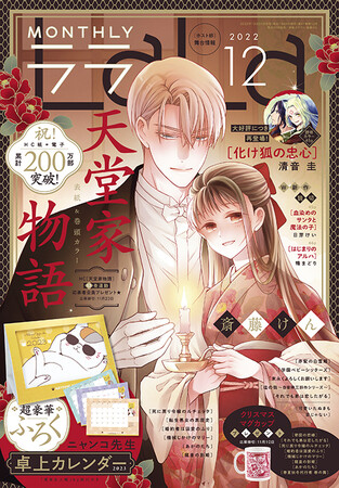 《株式会社白泉社》(本社:東京都千代田区、代表取締役社長:菅原弘文)は、『LaLa』2022年12月号を10月24日(月)に発売いたします。今号のふろくは毎年恒例の「ニャンコ先生卓上カレンダー2023 『夏目友人帳』by緑川ゆき」! 表紙&巻頭カラーを飾るのは「天堂家物語」(斎藤けん)です。紙+電子累計200万部突破の大ヒット作の最新話を掲載。プレゼント企画もありますのでお楽しみに。『LaLa』2022年9月号に掲載された読切が大好評につき、「化け狐の忠心」(清音圭)がカラーつきで再登場! 大人気連載陣「末永くよろしくお願いします」(池ジュン子)&「龍皇の影姫」(大宙晃)がカラーつきで登場です。