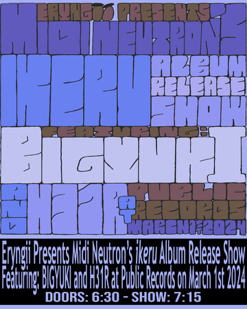 ニューヨーク - この度エリンギレコードから Midi Neutronのデビューアルバム、「ikeru」(行ける)が2024年3月にリリースされる。それを記念して、エリンギはPublic Recordsでアルバムリリースショーを開催する。ヘッドライナーはBIG YUKIでオープナーはH31R。6:30 PM 開場で開演は7:15 PMとなっている。