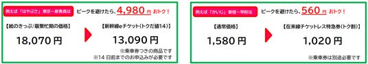 新幹線や特急列車の普通車指定席を通常より割引でご利用いただける「新幹線 e チケット(トクだ値)」、「在来線チケットレス特急券(トク割)」の座席数を、ピークを避けた以下の対象日に多めに設定!