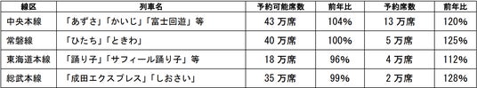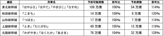 8月9日(金)から8月18日(日)までの10日間における指定席予約席数は7月25日(木)現在(※1)、新幹線117万席(前年比119%)、在来線を含めた全体では144万席(前年比119%)となっております。