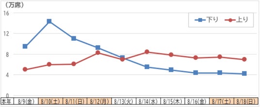 ■下りのピーク日は8月10日(土)で、約14万3千席のご予約をいただいております。