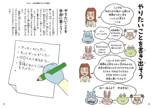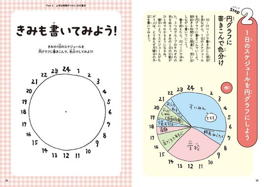 基本となる1日のスケジュールの組み立て方、夏休みなどの長期休みの計画の立て方などを、円グラフやカレンダーを用いながら、楽しく解説。実践しやすいノウハウがつまっています。