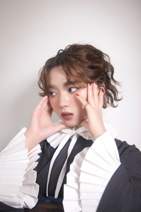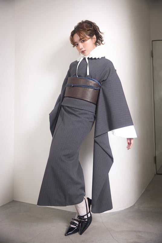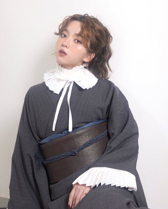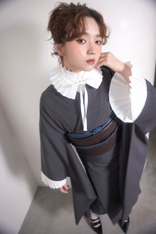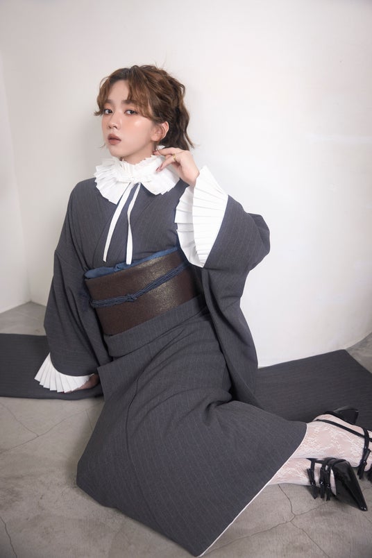 プリーツの襟と袖でクラシカルなテイストをプラス。ブラウンボルドーの帯にネイビーの小物合わせでこなれ感をプラスし、足元はポインテッドパンプスとレースソックスでガーリーさを演出しました。