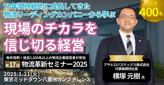 日本最大級の物流コンサルティングファーム 船井総研ロジ株式会社(本社:大阪市中央区、代表:橋本直行、以下「船井総研ロジ」)は、2025年1月21日(火)13:00~16:30、運輸・物流業の経営者・幹部を対象にした「第17回 物流革新セミナー」を開催いたします。本セミナーではアサヒロジスティクス株式会社 横塚社長を特別ゲストに迎えて「現場のチカラを信じ切る経営」についてご講演いただきます。