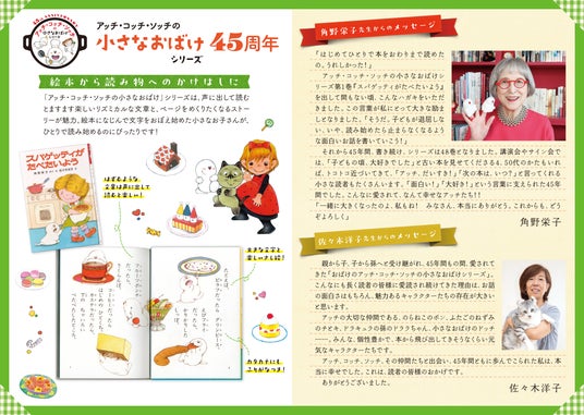 1979年に『スパゲッティがたべたいよう』でスタートした「アッチ・コッチ・ソッチの小さなおばけシリーズ」は、 魅力的なキャラクターと自由な発想のストーリーで、 子どもたちの大きな支持を集め、親から子へと世代を超えて読み継がれています。 角野栄子さんのライフワークとして毎年新刊が発表され、 幼年童話のロングセラー・シリーズとしてファンを増やし続けています。