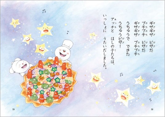ところが、コンクールでピザの種をくるくるまわしたら、空高くのぼってしまい、お月さまに助けられます。空の上でアッチが作った「うちゅうピザ」に、お月さまも星の子たちも大よろこび! そして、コンクールの結果は?