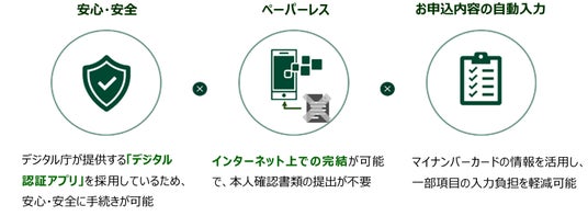 公的個人認証サービスは、マイナンバーカードのICチップに搭載された電子証明書を利用し、本人確認書類の偽造や他人によるなりすまし、データの改ざんといった不正を防止することで、安全かつ確実な本人確認を実現するサービスです。本機能の導入により、本人確認のための書類のご提出や顔写真の撮影が不要となることに加え、氏名や住所等、一部の申込内容の入力が不要となり、よりスムーズに手続きいただけます。