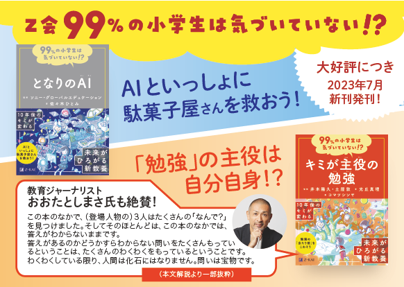 株式会社増進会ホールディングス(Z会グループ)のグループ会社、株式会社Z会ソリューションズは、『99%の小学生は気づいていない!?』シリーズ『99%の小学生は気づいていない!? キミが主役の勉強』、『99%の小学生は気づいていない!? となりのAI』を2023年7月1日に発刊。