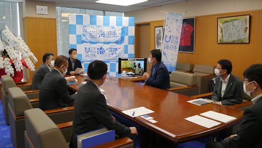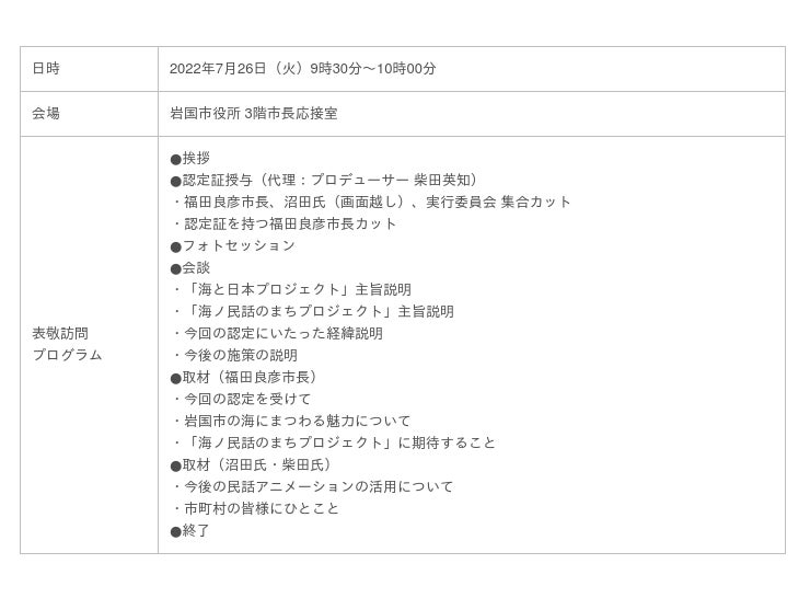 日本中に残された海にまつわる民話を発掘し、その民話のストーリーと、そこに込められた「想い」「警鐘」「教訓」を、親しみやすいアニメーションとして映像化します。当日は、ゼネラルプロデューサーをはじめとする事務局メンバーが「海ノ民話のまち」として認定した15のエリアのうちの1つである山口県岩国市の福田良彦市長を表敬訪問し、「海ノ民話のまち」認定証贈呈式を行いました。※ゼネラルプロデューサーはオンライン参加。