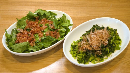 春到来!急に暖かくなってきた4月。 財前家の畑にも力強い緑がたくさん育ってきました。その中でもひと際青く輝いていたのが高菜!以前番組で久住高菜と三池高菜の2種類を植えましたが、皆さん覚えていらっしゃいますか?まずはそんな2種の高菜を収穫していきます。一言に同じ高菜ですが、どんな違いがあるのでしょうか?高菜と言えばお馴染みの漬物、そして実はサラダでも美味しいんです…!