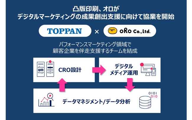 凸版印刷株式会社(本社:東京都文京区、代表取締役社長:麿 秀晴、以下 凸版印刷)と株式会社オロ(本社:東京都目黒区、代表取締役社長:川田 篤、以下 オロ)は、デジタルマーケティングにおけるパフォーマンスマーケティング(※1)領域での顧客企業支援で連携。両社はサービス開発およびセールス活動で2022年3月下旬より協業を開始します。