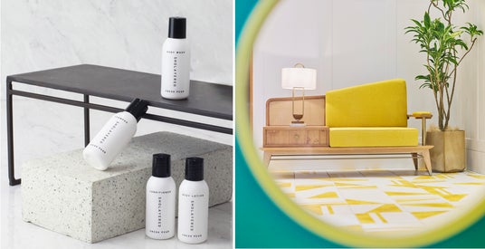 左:SHOLAYEREDバスアメニティ「Fresh Pear」 右:GINZA POPを表現したホテルエントランス