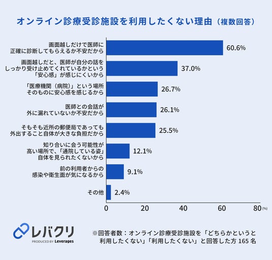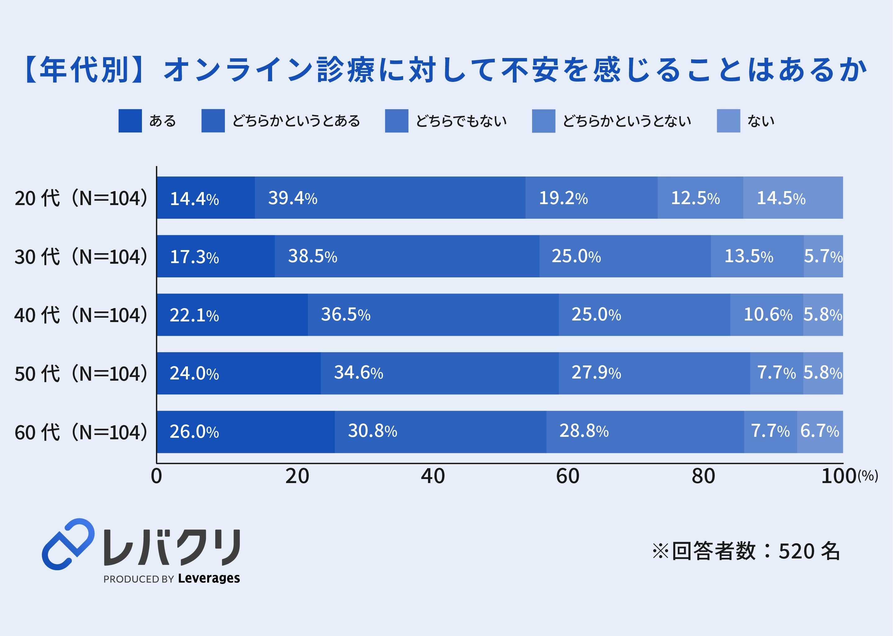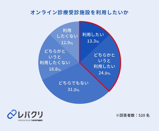 レバレジーズ株式会社が運営するオンライン診療プラットフォーム「レバクリ」(https://levcli.jp/)は、直近1年以内に対面にて病院受診の経験がある520名を対象に、オンライン診療の利用意向に関する調査を実施しました。
