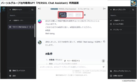 「はたらいて、笑おう。」をグループビジョンに掲げるパーソルホールディングス株式会社(本社:東京都港区、代表取締役社長 CEO:和田 孝雄、以下パーソルホールディングス)は、2024年6月に日本マイクロソフト株式会社(本社:東京都港区、以下マイクロソフト)が提供するAzure OpenAI Service※1の最新モデルGPT-4oの国内先行導入企業に選出され、パーソル社内専用GPT「PERSOL Chat Assistant」に搭載しました。パーソルグループでは社内専用GPTを国内グループ全社・社員約19,000人に展開し、利用率は66%を超えています。GPT-4oを搭載することでさらなる業務効率化・業務時間の削減を進めることを、本日お知らせいたします。