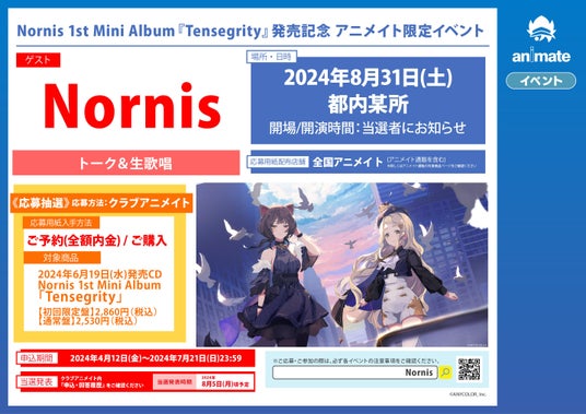 アニメイト全店(アニメイト通販含む)にてNornis 1st Mini Album『Tensegrity』初回限定盤(POCS-39048/9)または通常盤(POCS-30025)いずれかをご予約(全額内金)もしくはご購入を頂いた方を対象に、抽選で「Nornis 1st Mini Album『Tensegrity』発売記念イベント」へご招待いたします。
