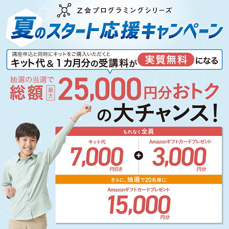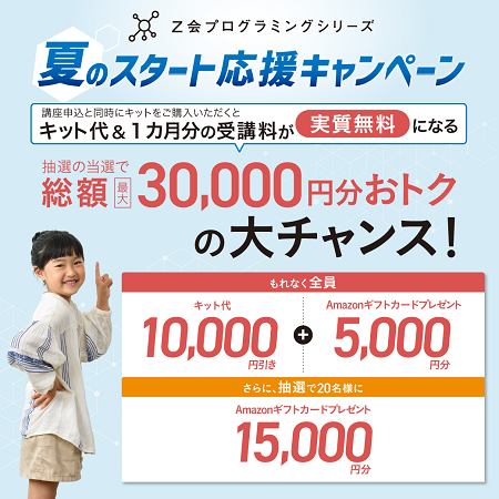 株式会社増進会ホールディングス(Z会グループ)のグループ会社である株式会社Z会は、自宅で学べる小学生~中学生向けの「Z会プログラミングシリーズ」において「Z会プログラミング講座 みらい with ソニー・グローバルエデュケーション」「Z会プログラミング中学技術活用力講座 コンピュータ活用編」を対象として、「キット代割引&Amazonギフトカードプレゼント」のキャンペーンを実施中です。ぜひこの機会にご受講をご検討ください!