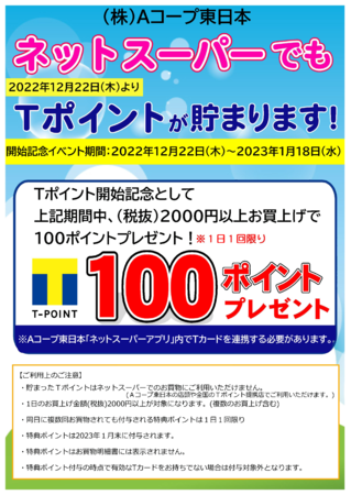 また、サービス開始を記念して、2022年12月22日(木)~2023年1月18日(水)の期間中に「ネットスーパー利用促進キャンペーン」を実施いたします。Aコープ東日本ネットスーパーにTカード連携後、ネットスーパーで2,000円(税抜)以上お買い物いただくと、1日1回Tポイントが100ポイント貯まります。ぜひ、この機会にお試しください。