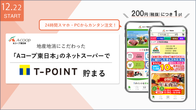 JA全農のグループで関東・東北エリアで食品スーパーマーケットなどを展開する株式会社Aコープ東日本(本社:神奈川県横浜市、代表取締役社長:宗村達夫、以下「Aコープ東日本」)とCCCMKホールディングス株式会社(本社:東京都渋谷区、代表取締役社長:高橋誉則、以下「CCCMKHD」)は、三重県を中心にスーパーマーケット事業や店舗宅配事業(ネットスーパー)を展開するスーパーサンシ株式会社(本社:三重県鈴鹿市、代表取締役社長:田中 勇、以下「スーパーサンシ」)と連携し、12月22日(木)より「Aコープ東日本」が提供するネットスーパーのご利用でTポイントが貯まるサービスを開始いたします。
