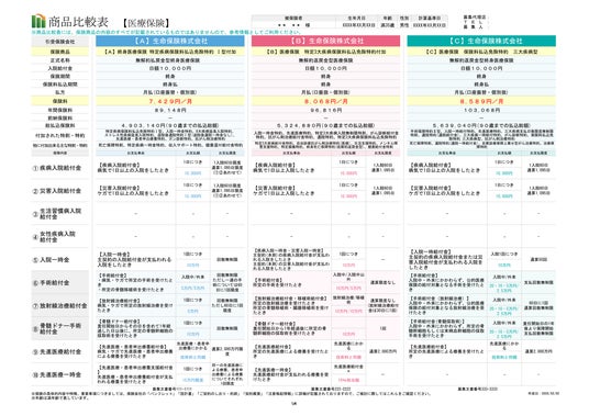 お客様のご希望をもとに保険商品を検索し、その中からさらにお客様のご希望に沿った複数の保険商品を同じフォーマットで並べた比較表をお出しします。別々の保険会社・保険商品で並べたり、同じ保険商品の中でも保障額や特約を変更して並べることもできます。ご希望に沿わない場合は条件を変更して何度でもお出しいたしますので、ご納得できるまで比較頂けます。