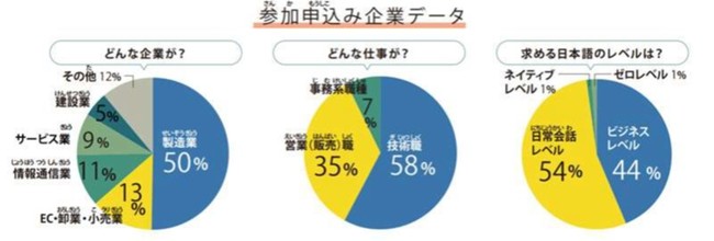 今回の開催に際し126社の参加申し込みがあり、うち約74%が1都3県(神奈川・埼玉・千葉)以外の地方企業で占めています。また、業種別で見ると製造業が50%と半数を占め、職種別では技術職が58%と専門職の募集が多いこと、加えて外国人求職者に求める日本語のレベルはビジネスレベルが44%であったことから、専門性と語学力を兼ね備えた高度外国人材へのニーズが高まっていることが伺えます。