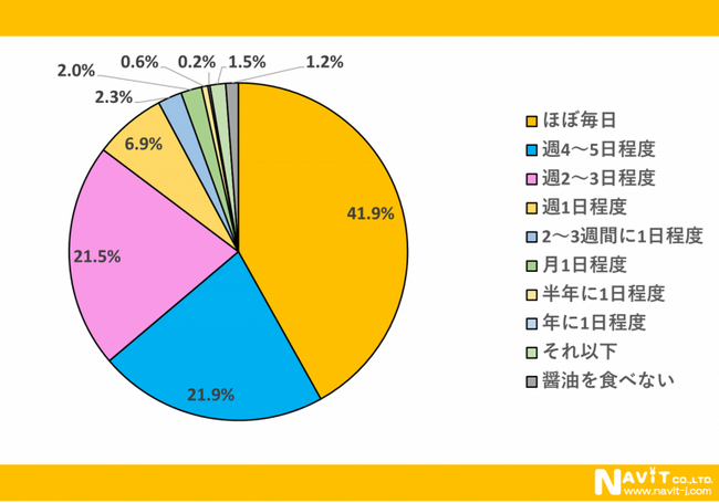 「ご自宅で料理をされる際、どのくらいの頻度で醤油を使用しますか?」という質問を行ったところ、「ほぼ毎日」が41.9%、「週4~5日」が21.9%、「週2~3日」が21.5%という順になりました。毎日の食卓に醤油は欠かせないようですね!