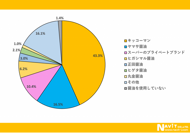 現在使用している醤油について複数選択可能で質問したところ、「キッコーマン」が43.3%、次いで「ヤマサ醤油」が16.5%、「スーパーのプライベートブランド」10.4%という順になりました。