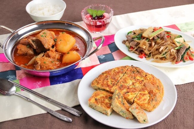 韓国料理好き集まれ!!豚スペアリブとジャガイモがゴロゴロ入ったカムジャタンは、コチュジャンベースのスープに豚の旨味が効いた、辛みの中にも奥深さのある絶品鍋です。定番のチャプチェと、韓国の家庭料理ケランマリも覚えておきたいメニューです。暑い夏こそ辛い物を食べて、夏を乗り切りましょう!