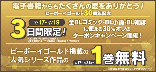 1巻無料&2025年7月17日~7月19日【3日間限定】BLコミック・BL小説・BL雑誌に使える30%オフのクーポンキャンペーン開催!
