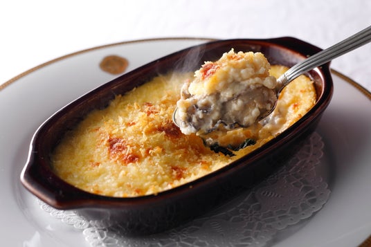 帆立貝、海老、白身魚をメインにホワイトソースで仕立てたグラタンです。レースのようにあしらったマッシュポテトと一緒にお召し上がりください。