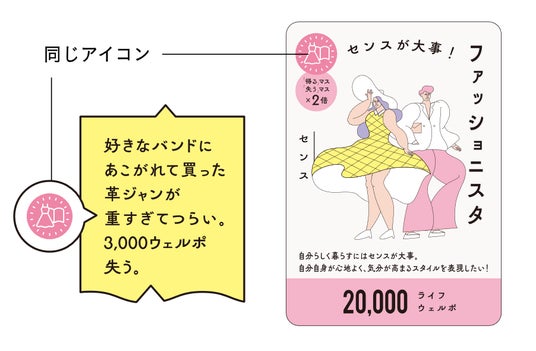 たとえば、下図のケースではアイコンが一致しているので、カードの記載「失うマス×2倍」に従い、「3,000ウェルポ失う×2」で6,000ウェルポ失います。