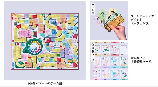 「100年人生ゲーム」は幸福を点数化したウェルビーイングポイントを集め、“幸せな100年人生”を疑似体験するボードゲームです。 ゴールの「100歳の誕生日」までに、ウェルビーイングポイントを一番集めたプレイヤーの勝利となります。20歳の誕生日マスでは、健康を重視する「健康マニア」や仕事の成功を第一に考える「情熱ワーカー」など、プレイヤーの価値観を表すカード(全14種)を選択します。その価値観によって、同じマスに止まっても獲得できるポイントが異なることがあります。(詳細は下記)