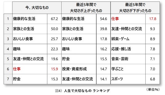 まず、「あなたの人生において、今、大切なものは何ですか」と聞いたところ「健康的な生活」(67.2%)が抜きんでて高く、「仕事」(15.9%)は6番目となりました。また、「最近5年間で大切さが下がったもの」では、「仕事」(17.8%)が1番目。価値観が変化する中で、仕事の重視度が低下傾向にあることがわかりました。