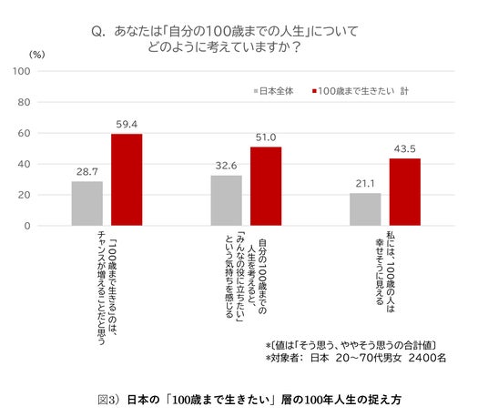 但し、日本でも「100歳まで生きたい」と考える人に限っては、「チャンスが増える」(59.4%)、「幸せそうに見える」(43.5%)など、日本全体では低かった、長生きに関するポジティブな項目が高い傾向にありました。