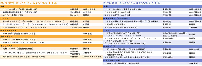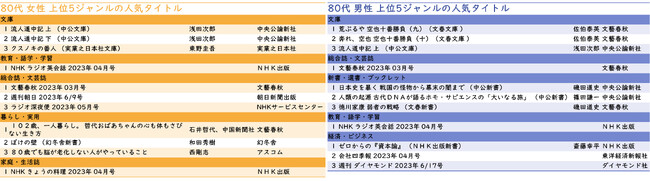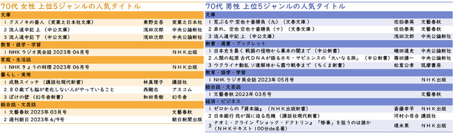 また、人気ジャンルでは女性・男性とも共通して「文庫」や「総合誌・文芸誌」が上位に位置し、「教育・語学・学習」「家庭・生活誌」ではNHKテキストの需要が安定していることが見えてきました。
