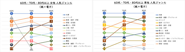 ●70代以上は「文庫」ジャンルで「時代小説」の人気が高まる傾向がある。