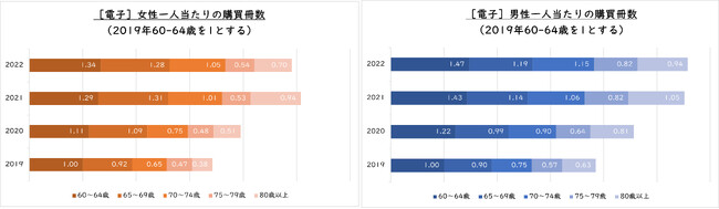 シニア層へのスマートフォン・タブレット等の普及もあってか2019~2022年の4年間で購買冊数は男女ともに増加傾向です。