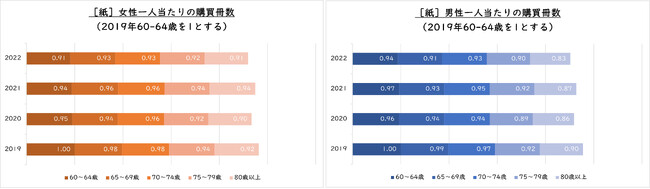 5歳区切りの年齢で購買冊数の変化をみると、年齢が上がるにつれ購買冊数は減少していきます。60-64歳と80歳以上で平均値を比較したとき、80歳以上女性は約「97%」、80歳以上男性は約