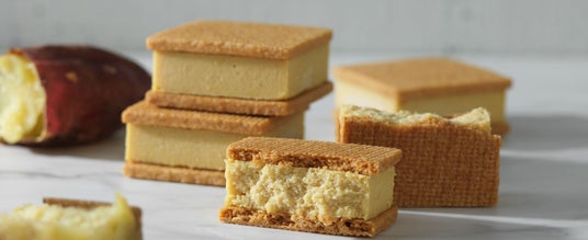 季節の限定味に「スイートポテト」が新登場です。クセの少ないオーストラリア産クリームチーズが安納芋の甘さを引き立てます。ほっこりとした味わいに仕上げたベイクドチーズケーキをしっとりとしたサブレでサンドしました。
