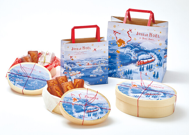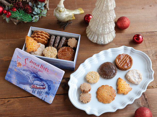 ノワ・ドゥ・ブールのクリスマスギフトは、パティシエのお家からフィナンシェを運ぶ小鳥たちが巡る風景を、ストーリー仕立てのイラストで表現しています。絵本のような可愛い缶の中には、雪の結晶型の「シナモンクッキー」の新作に加え、ツリー型の「バニラクッキー」、フランス産ミルク風味豊かな発酵バターを使用した「ガレット・ブルトンヌ」、カリカリッとした食感とナッツの風味豊かな「クロッカン」、ココナッツ味の「ココナッツ」、ほろりと崩れるココア味の「ディアマンショコラ」、香り高いヘーゼルナッツの味わいが楽しめる「ヘーゼルナッツサブレ」の7種類を詰め合わせています。