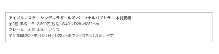 株式会社バンダイナムコアミューズメントは、『アイドルマスター シンデレラガールズ パーソナルパブミラー 木村夏樹』を2月9日(木)に発売します。「木村夏樹」は、「アイドルマスター シンデレラガールズ」に登場するアイドルの一人。8月19日生まれ、身長159cm。趣味はツーリングという茨城県出身の18歳です。同日より株式会社バンダイナムコエンターテインメントが運営するECサイト、「アソビストア」にて期間限定の受注販売を開始します。