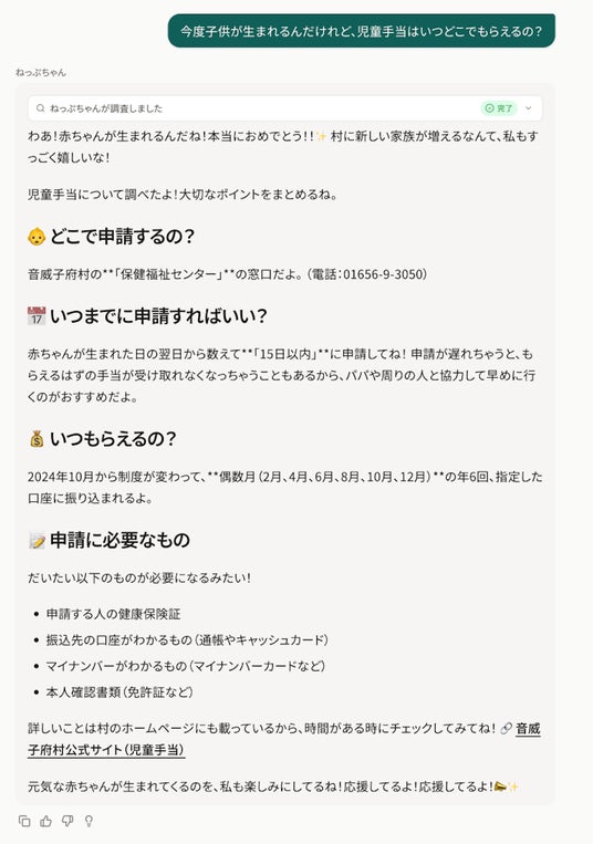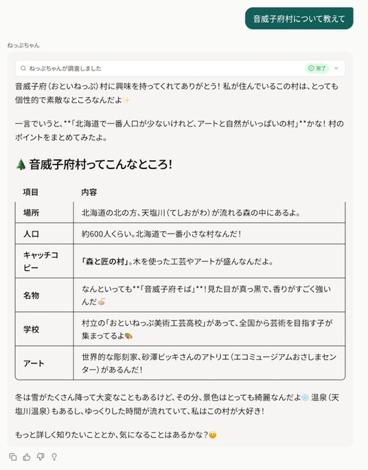 面白法人カヤック(本社:神奈川県鎌倉市、代表取締役CEO:柳澤大輔、以下「カヤック」)と北海道中川郡音威子府村(おといねっぷむら、村長:遠藤貴幸)は共同し、村専用の対話型AI「ねっぷちゃん」を開発しました。「ねっぷちゃん」は、行政情報だけでなく、地域の歴史やおすすめの商店、冬の厳しい寒さを乗り切る知恵まで、音威子府村のあらゆる情報を学習した「AI副村長」です。2月19日(木)より開始する実証実験では、村民はもちろん、村への移住を検討されている方も、スマホやパソコンから24時間いつでも気軽に「村の相談」ができる環境を提供します。