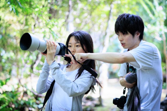 ゆ~とびさん自身のレンズを生徒に貸して望遠体験を教える一場面