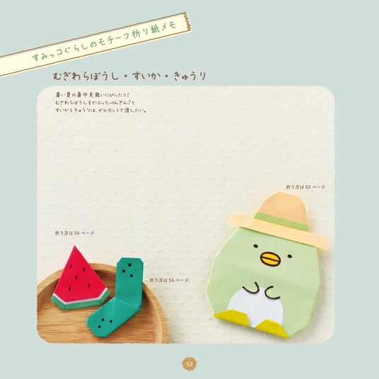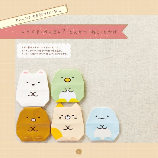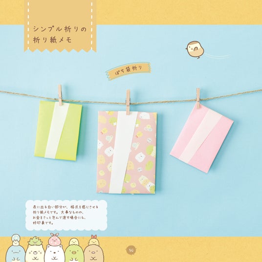 『すみっコぐらし折り紙メモBOOK 新装版』では、市販の折り紙で折れる「すみっコぐらし」のキャラクターや、巻末のオリジナルペーパーを使ったかわいい折り紙メモが作れます。
