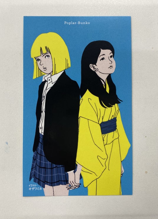 イラストは、主人公のミアと1冊の本でつながるフミコのふたり。