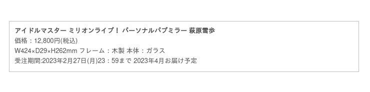株式会社バンダイナムコアミューズメントは、『アイドルマスター ミリオンライブ! パーソナルパブミラー 萩原雪歩』を2月10日(金)に発売します。「萩原雪歩」は、「アイドルマスター ミリオンライブ!」に登場するアイドルの一人。12月24日生まれ、身長155cm、趣味はMY詩集を書くこと。好きなものはブログという東京都出身の17歳です。同日より株式会社バンダイナムコエンターテインメントが運営するECサイト、「アソビストア」にて期間限定の受注販売を開始します。