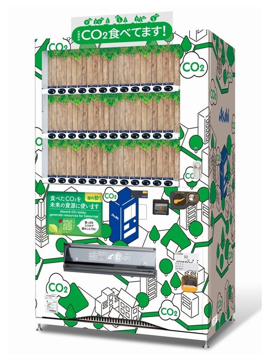 自動販売機は周辺の大気を吸いこみ、それを利用して商品を冷やしたり温めたりしていますが、「CO2を食べる自販機」は庫内に特殊材を搭載し、大気中のCO2を吸収する仕組みです。