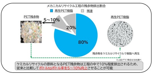 メカニカルリサイクルではリサイクルの工程で約20%の残渣が発生しますが、そのうち5~10%の残余物はペットボトル以外のものへのリサイクルが主となっています。残余物の一部にはペットボトル素材が含まれているため、残余物もペットボトル原料に再生することで、効率的かつ持続的なリサイクルが実現できます。